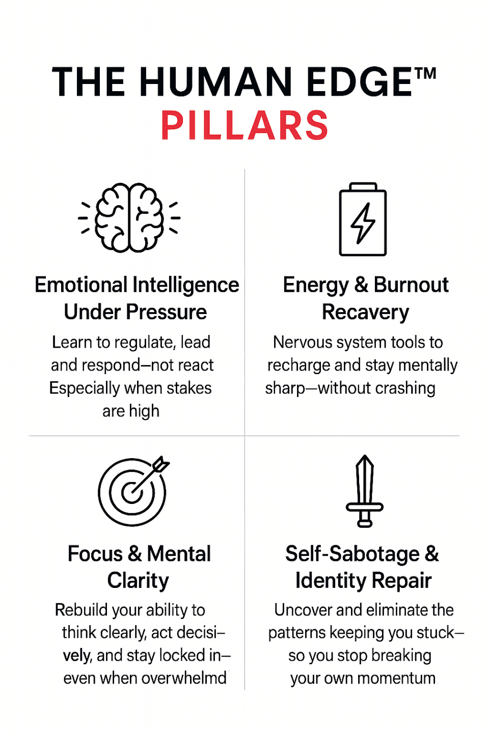 Using The CLEAR Method™ and the Four Pillars of Human Edge Performance, we’ll train your nervous system, mindset, habits, and communication so you can show up grounded and confident in real life—not just in theory.